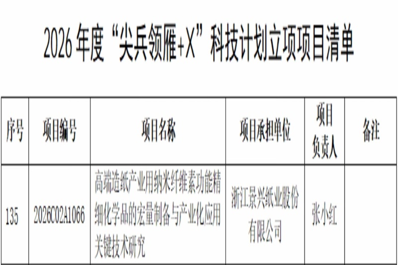 2025年12月30日,经过严格筛选,浙江省科学技术厅下达了2026年度“尖兵领雁+X”科技计划项目,6686体育网页登录承担的“高端造纸产业用纳米纤维素功能精细化学品的宏量制备与产业化应用关键技术研究”项目(编号:2026C02A1066)获批“领雁”项目。